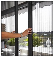 A függőleges alumínium tokszerkezetet ami 45 x 45mm-es, az ajtó tokjára kell rögzíteni, a háló egy keskeny alumínium keretben fut, ami vízszintesen oldalra húzható. Alkalmazható egy szárnyú illetve duplaszárnyú ajtóra is. A duplaszárnyúnál a hálók középen találkoznak és mágnes csíkokkal tapadnak egymáshoz.