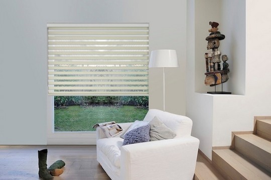 A textilek felületén sötétítő és fényáteresztő csíkok váltják egymást, így a két egymást követő sáv segítségével szabályozhatjuk a beáramló fény mennyiségét és az átláthatóságot. Ha kedvünk tartja, akár teljesen betekerhetjük a textilt a tokba.